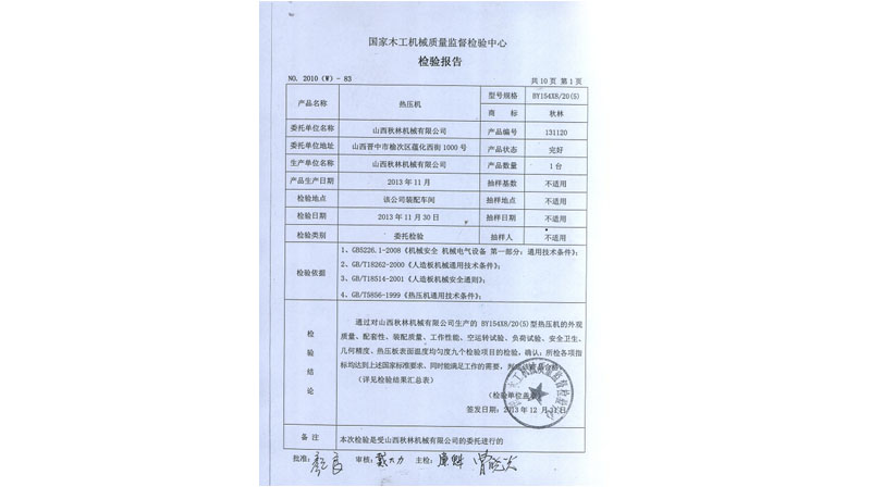 BY21型熱壓機(jī)、BY624×8/16、BY154×8/20(5)通過國家木工機(jī)械質(zhì)量監(jiān)督檢驗中心檢驗